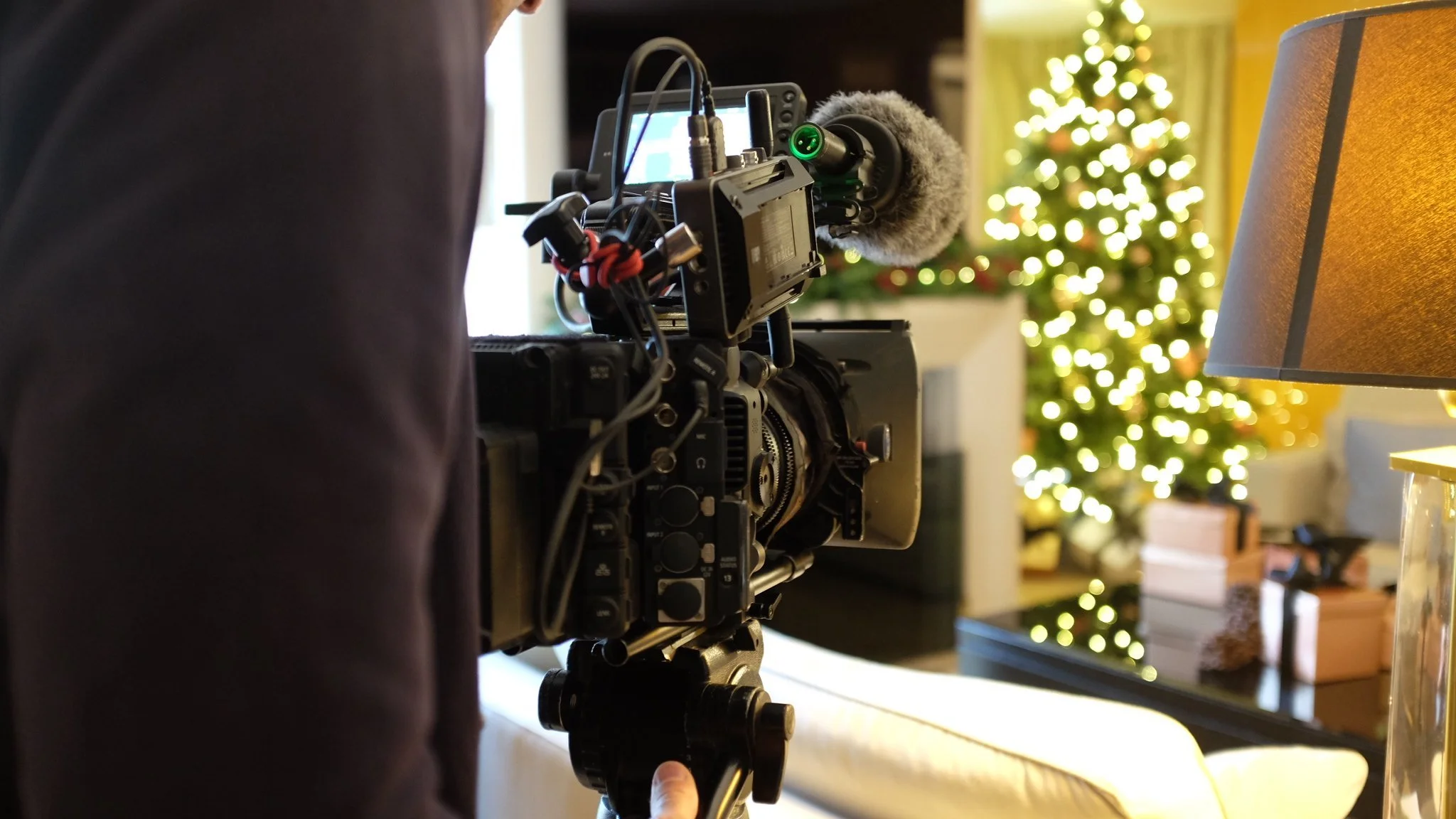 Camera filming a brightly lit Christmas tree and presents in a living room.